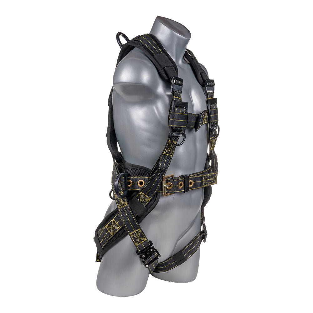 Black top , black padding , 5 point , QCB, padded back sewn in , grommet padded legs. Positioning belt black. 3 D-ring. SRL Loop. Oil & Dust Resistant. 2XL size. SRL back plate. Meets or Exceeds ANSI Z359.11-2014. A10.32-2012