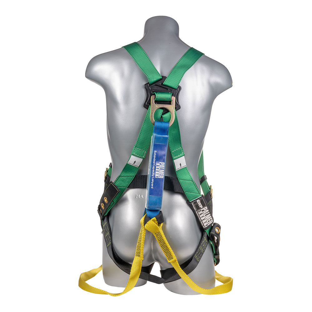Green Top, Black Heavy Duty Bottom with 5 point adjustment. Pass Through Chest, Grommet Legs, Back D-ring. Universal size. With Dual Lanyard Tie Back hooks Meets or Exceeds ANSI Z359.11-2014. A10.32-2012.