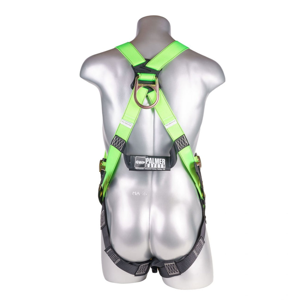 High Vis Green Top, Black Heavy Duty Bottom with 5 point adjustment. Quick Connect Chest, Grommet Legs, Back D-ring. Universal size. Meets or Exceeds ANSI Z359.11-2014. A10.32-2012.