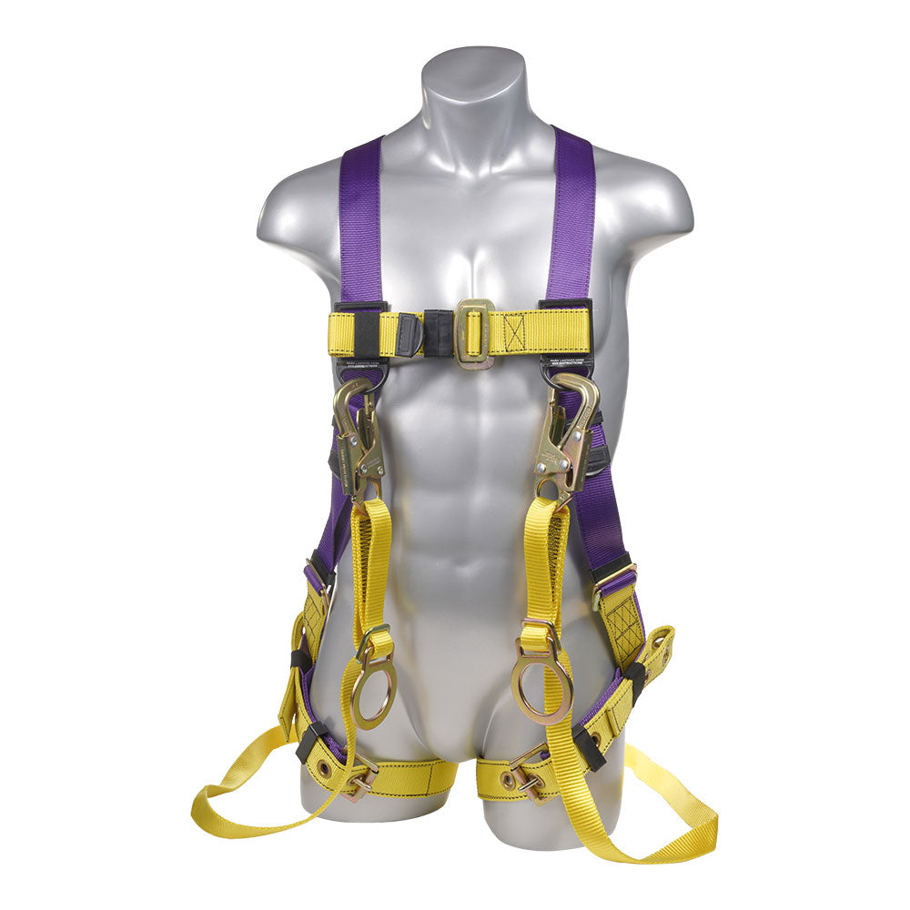 Purple Top, Yellow Heavy Duty Bottom with 5 point adjustment. Pass Through Chest, Grommet Legs, Back D-ring. Universal size. With Dual Lanyard Tie Back hooks Meets or Exceeds ANSI Z359.11-2014. A10.32-2012.