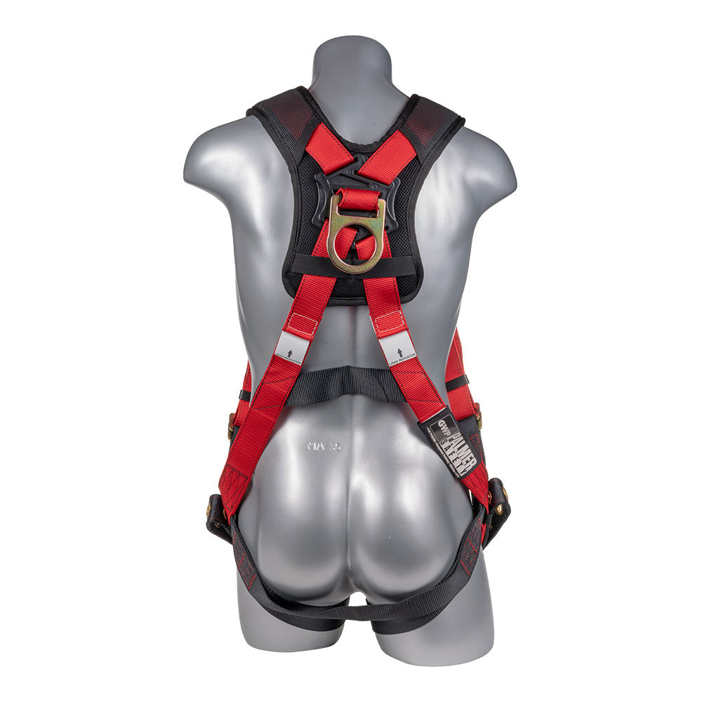 Red top, black bottom. Full body harness with 5 point adjustment, dorsal D-ring, grommet leg straps, Fall Indicators. . This is a premium harness with full padding Leg, shoulder/back. D ring plate. Meets or Exceeds ANSI Z359.11-2014. A10.32-2012