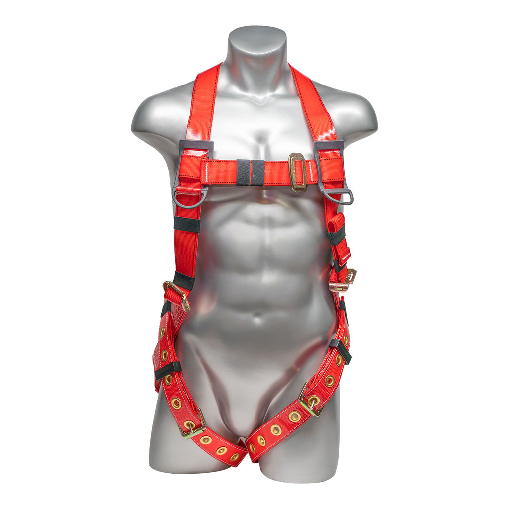 Red top Urethane Coated harness with 5 point adjustment, Pass Through Chest, dorsal D-ring, grommet leg straps, Fall Indicators. Universal size. Meets or Exceeds ANSI Z359.11-2014. A10.32-2012.